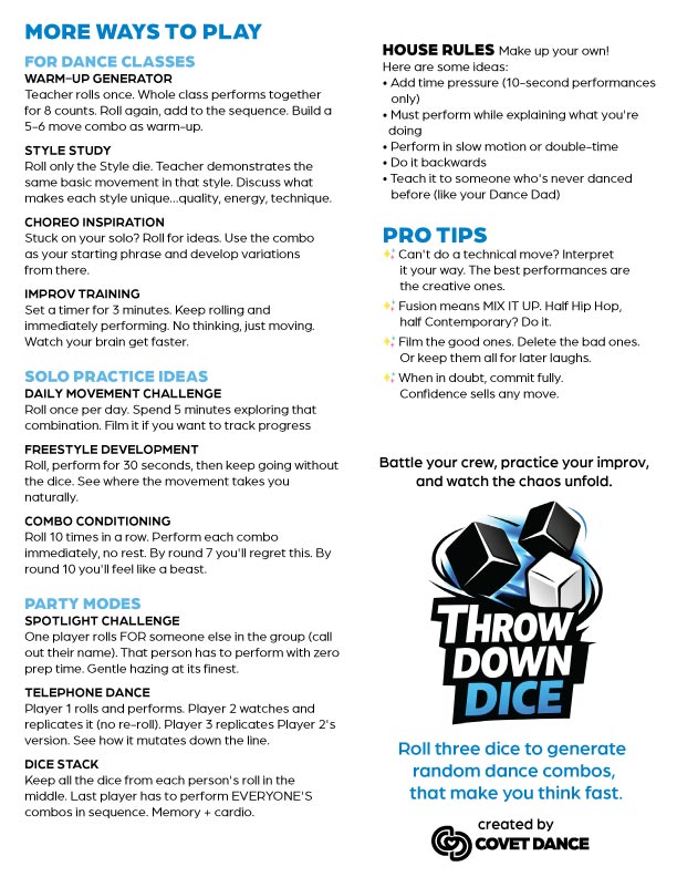 Your new favorite way to kill time, crack up your crew, and sharpen those improv skills without even trying. Roll three foam dice to randomly generate two dance movements + one style, then watch the chaos unfold. Will you nail that Moon Walk/Chassé combo in Ballet?